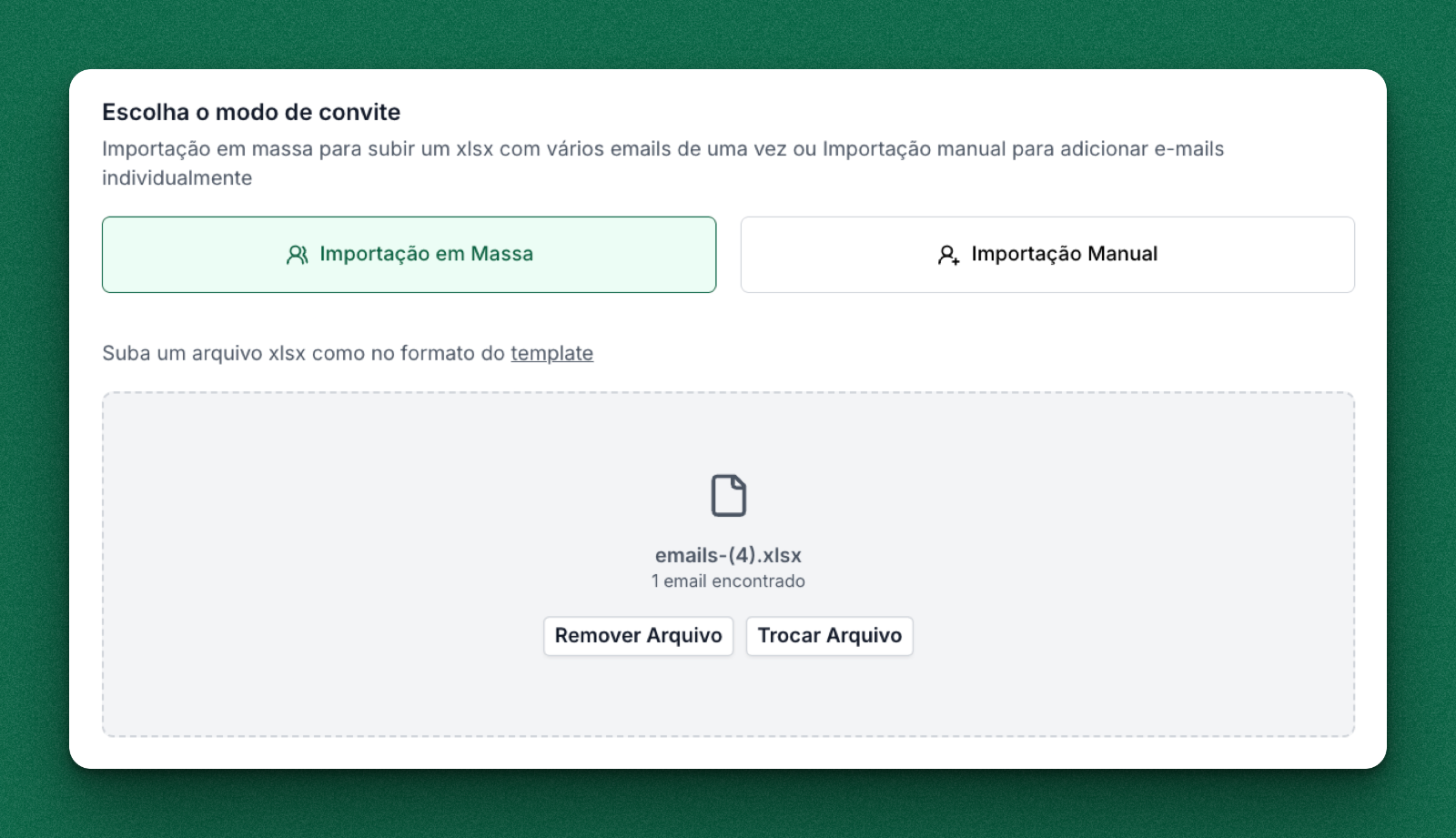 Existem duas formas de importar alunos para sua plataforma: através de um arquivo .xlsx com os dados ou adicionando emails manualmente.