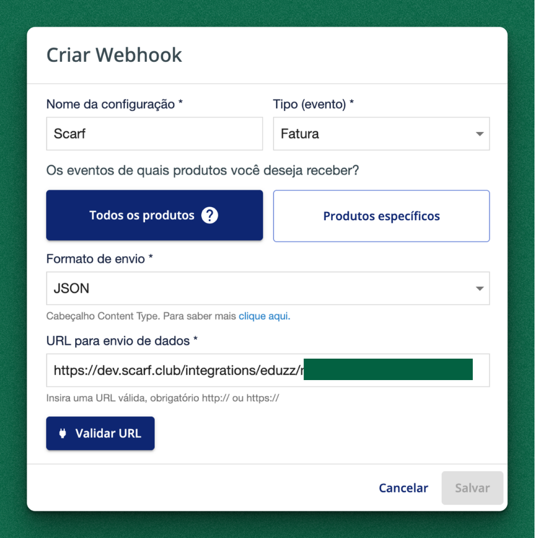 - URL para envio de dados: Cole o link que você copiou da Scarf no Passo 1